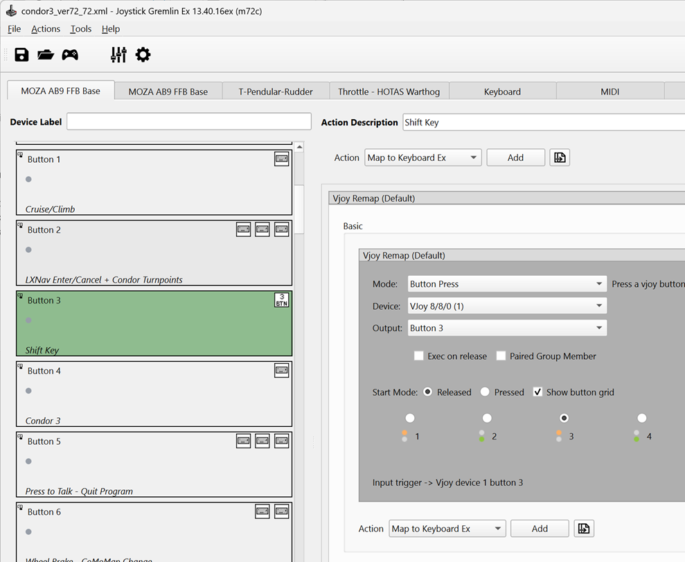 Below is a sample pages from Joystick Gremlin EX showing how I set up button 3 on the stick to give a “Shifted” layer.