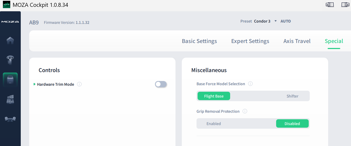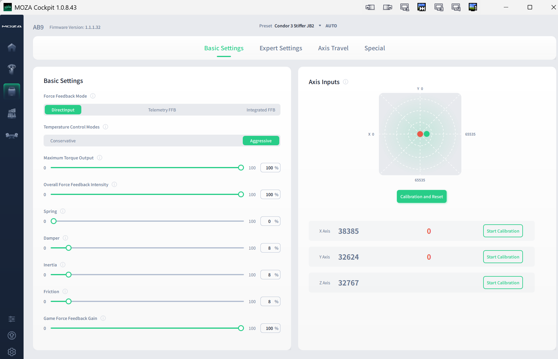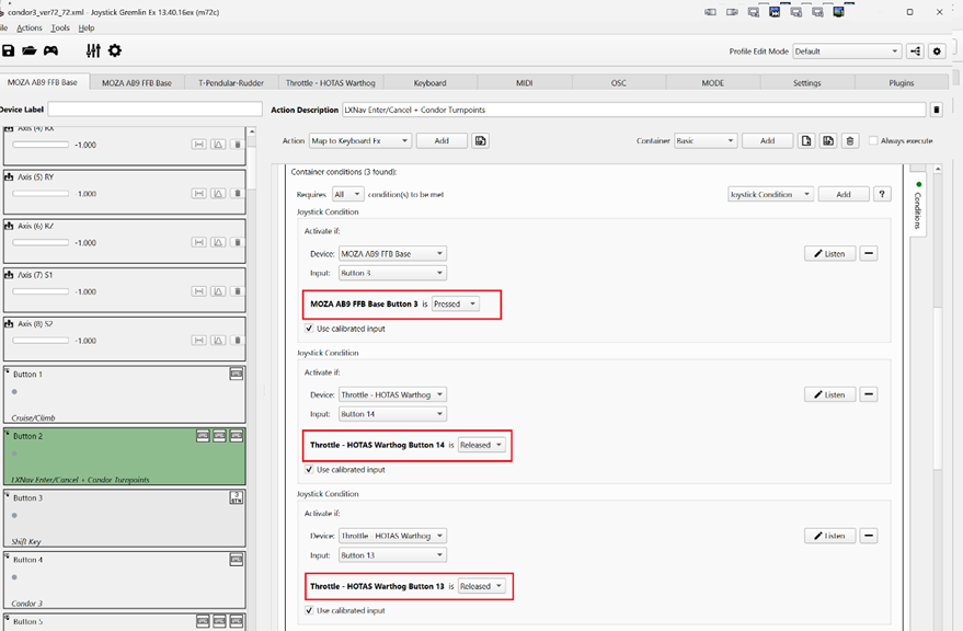 I need to emphasise this. You ONLY USE THE MOZA COCKPIT SOFTWARE FOR FORCE FEEDBACK SETTINGS! All Condor input settings are either bound in Condor 3 itself, and/or you use software like Joystick Gremlin EX, Thrustmaster GUI/Scripting, or JoyToKey. You don’t set any button assignments in the MOZA AB9 software.