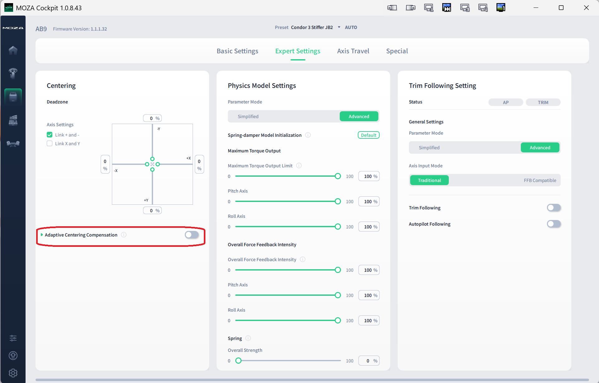 I had a couple of strange glitches on my first flight with the MOZA AB9, when the elevator suddenly tried to fight with me. Letting go of the stick recentred things, but it was disconcerting. A helpful user on the MOZA Discord Server suggested turning off Adaptive Centering Compensation would be a good idea too.